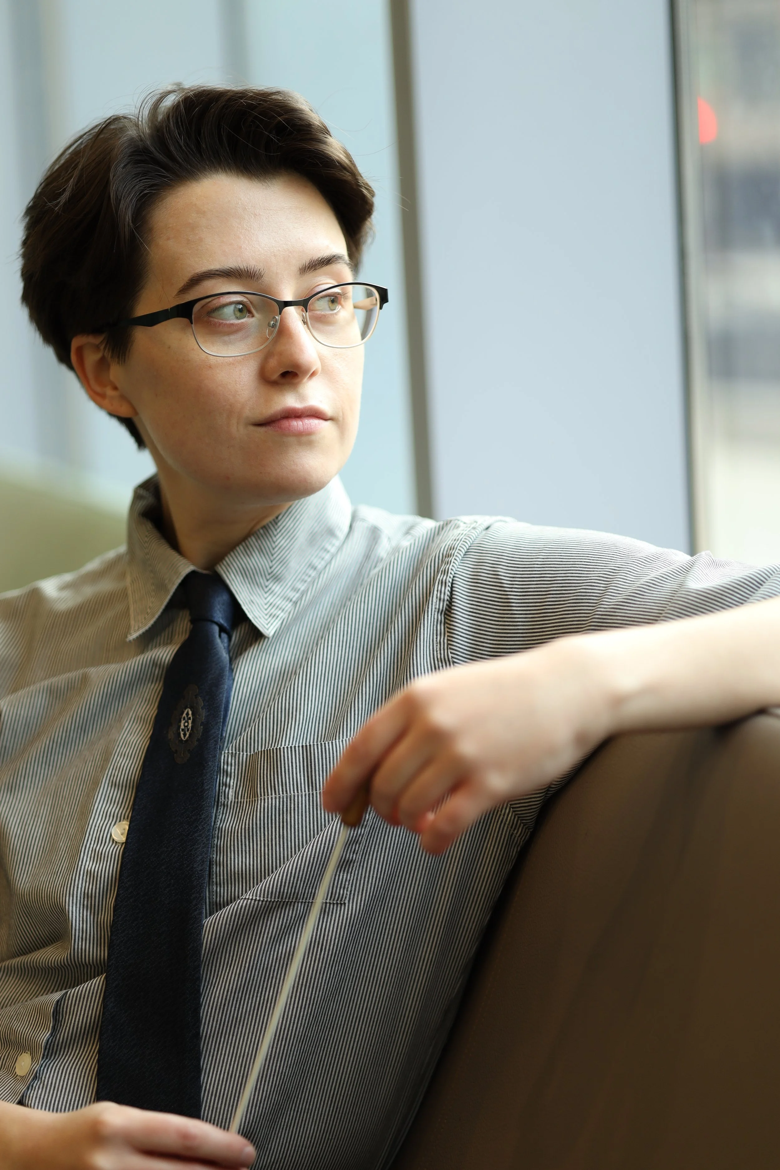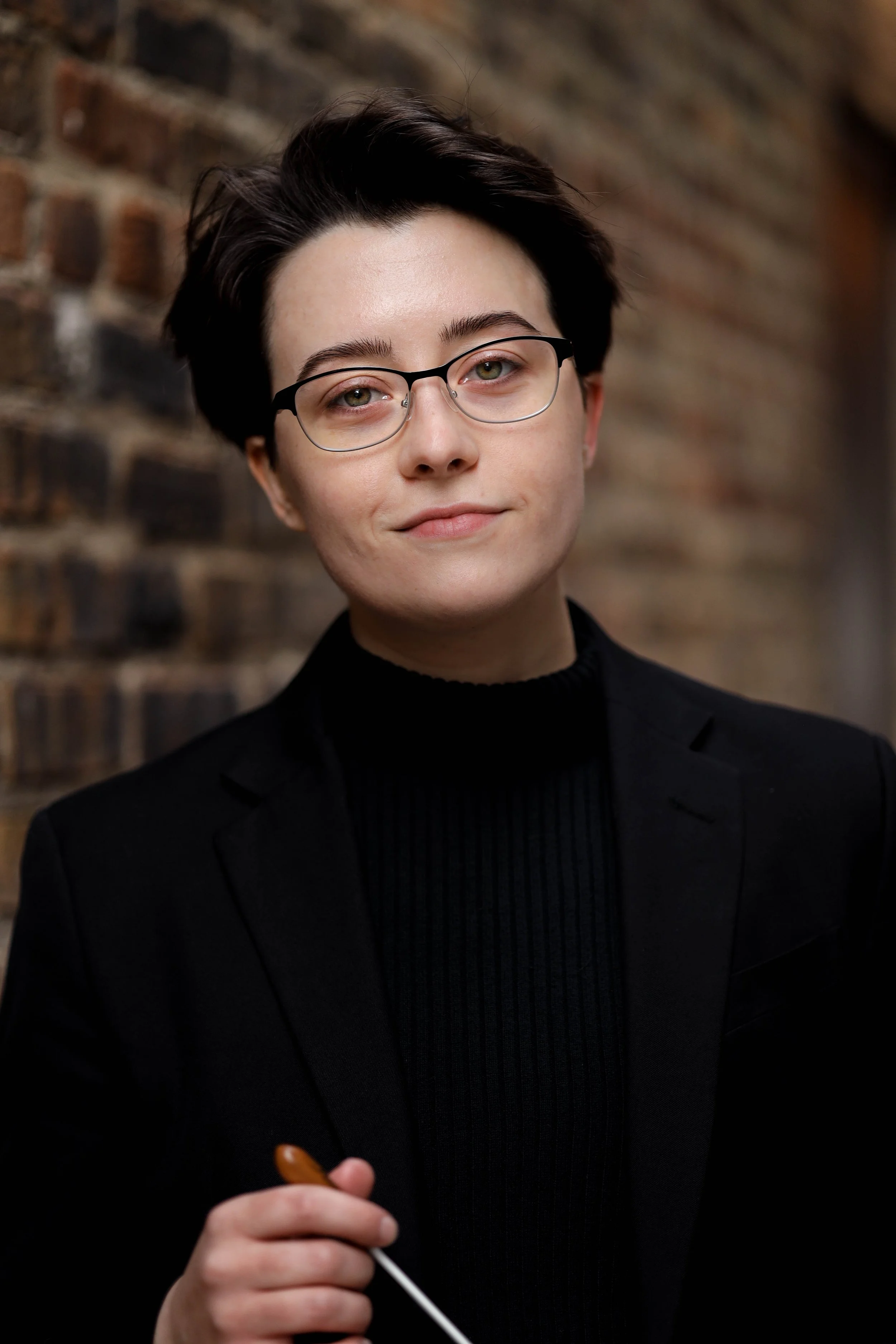 A person with short dark hair and glasses holding a conductor's baton with a brown tip, standing in front of a brick wall.