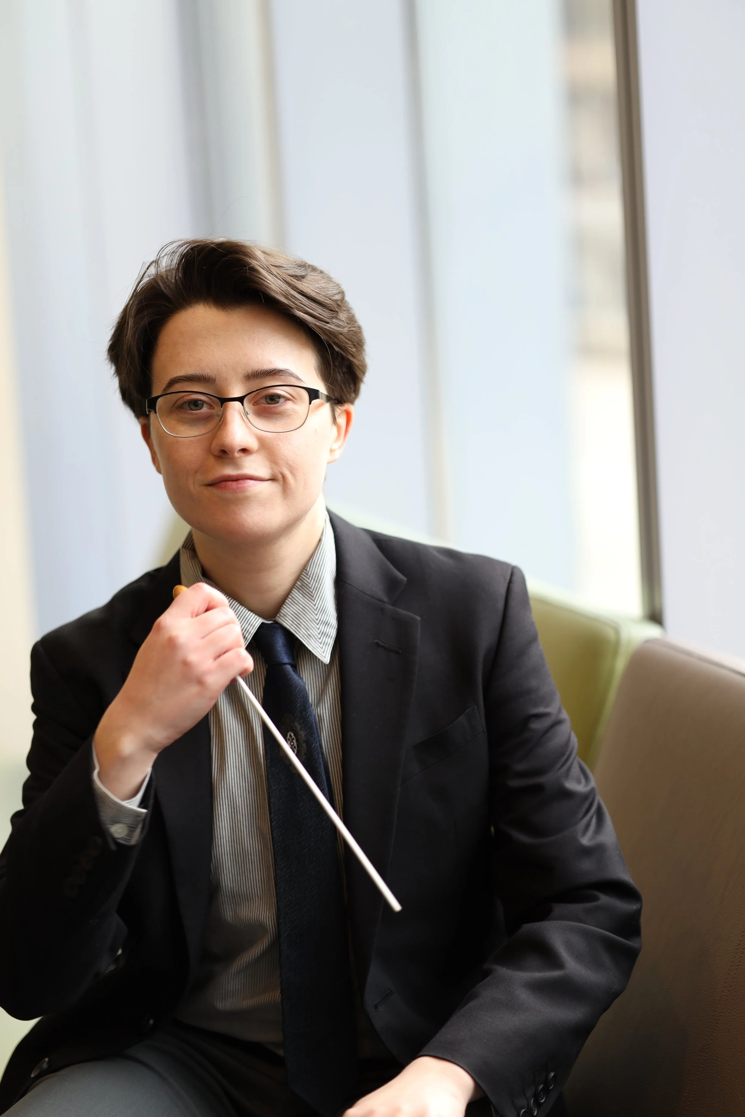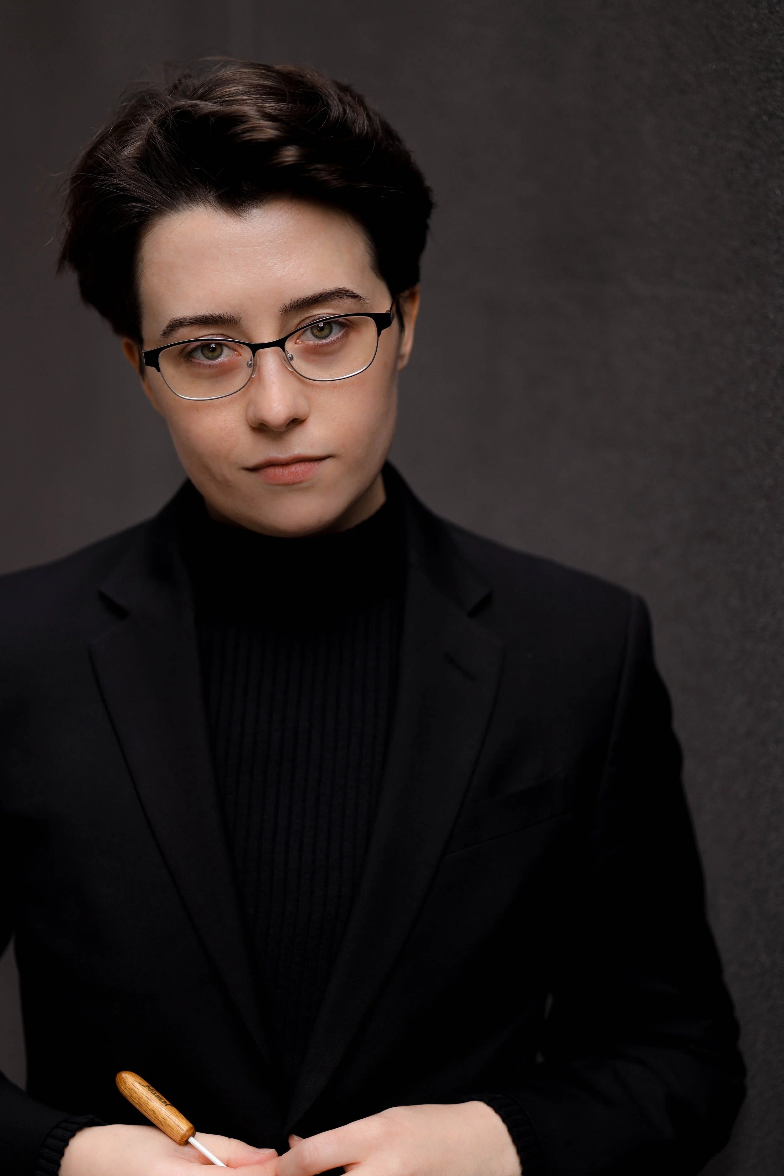 A person with short dark hair, glasses, and light skin wearing a black suit and turtleneck, holding a conductor's baton, standing against a dark background.