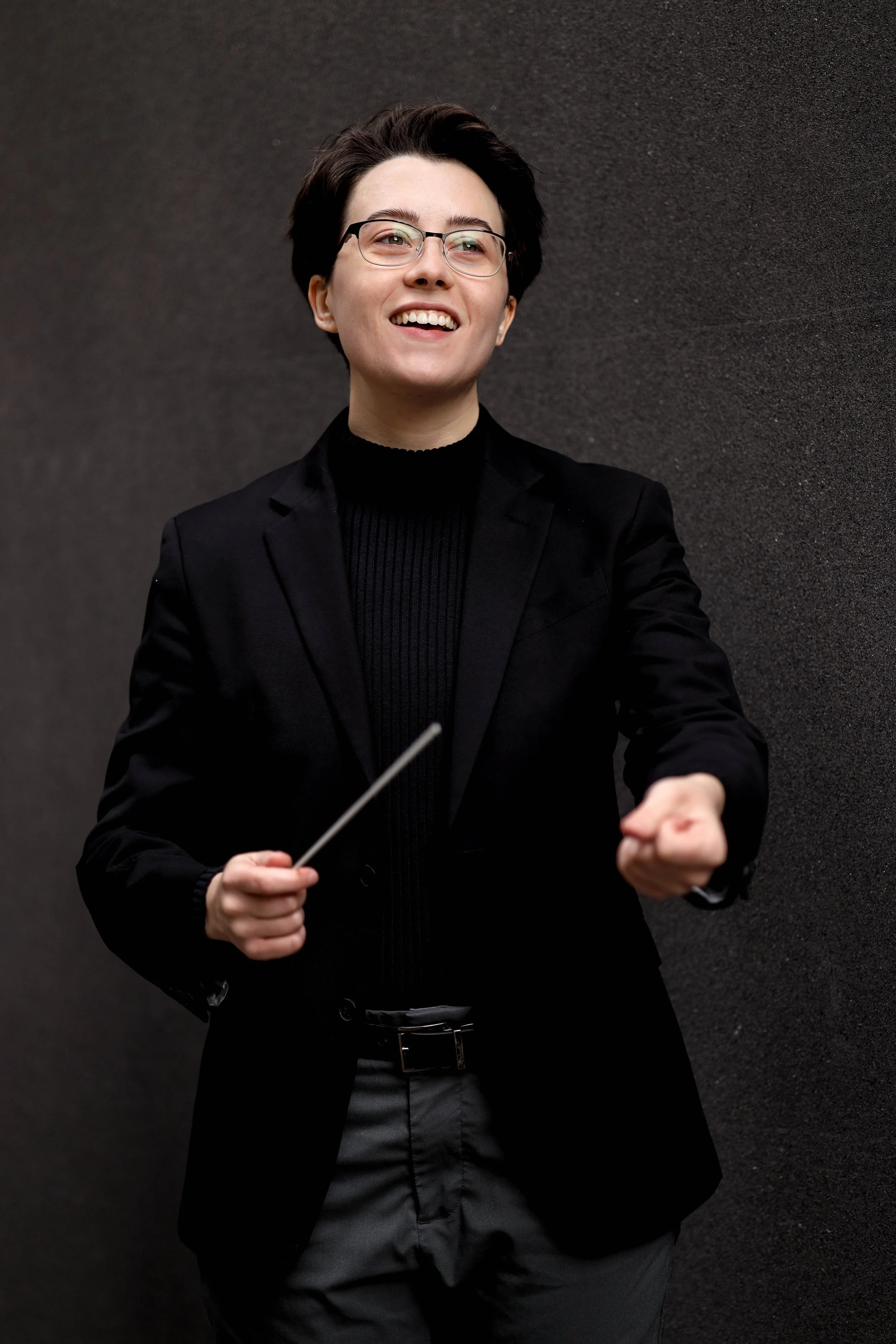 A person with short black hair and glasses wearing a black blazer and black turtleneck, smiling and conducting with a baton against a dark textured background.