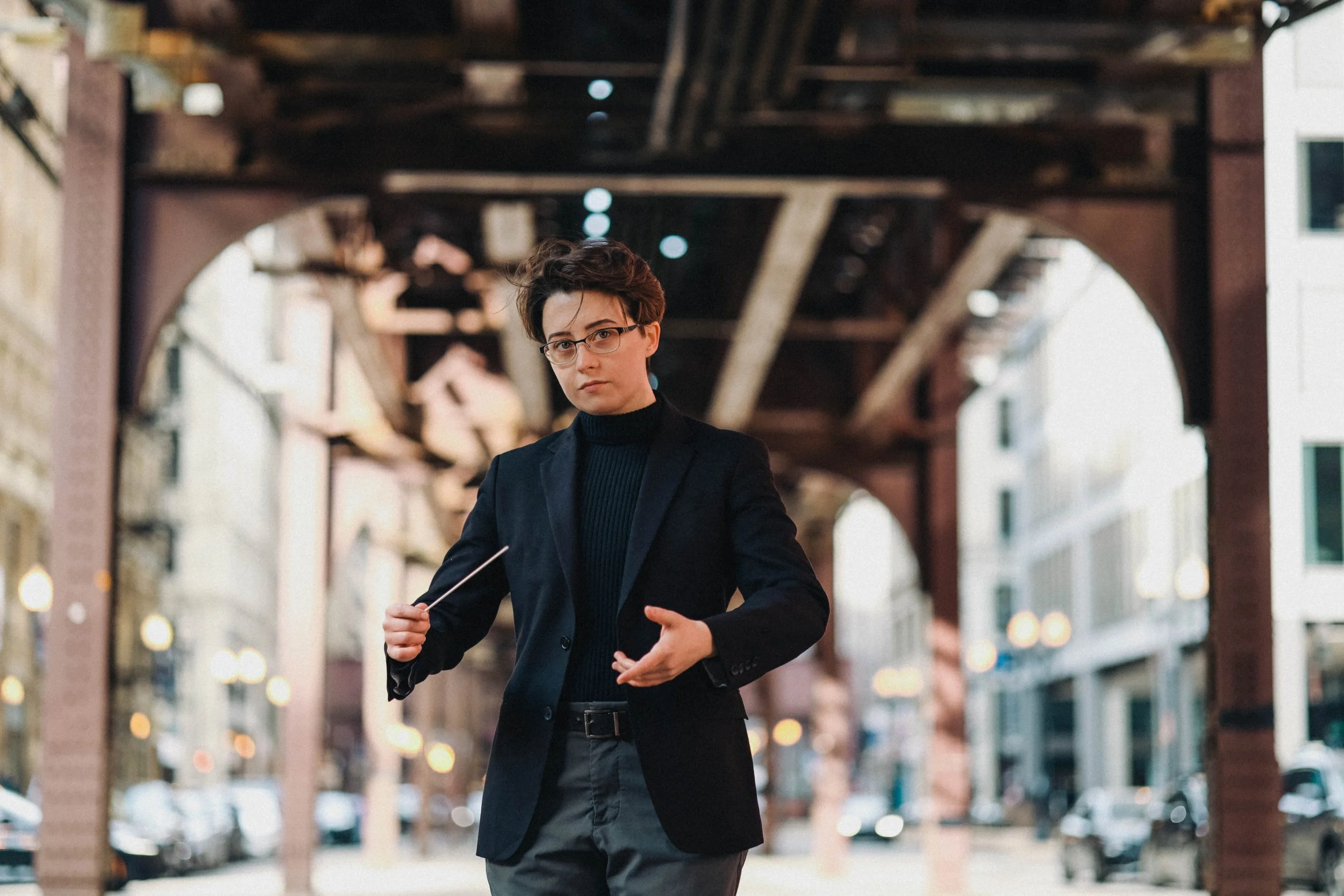 A person with short hair and glasses conducts an orchestra outdoors under a bridge, wearing a dark blazer and sweater.