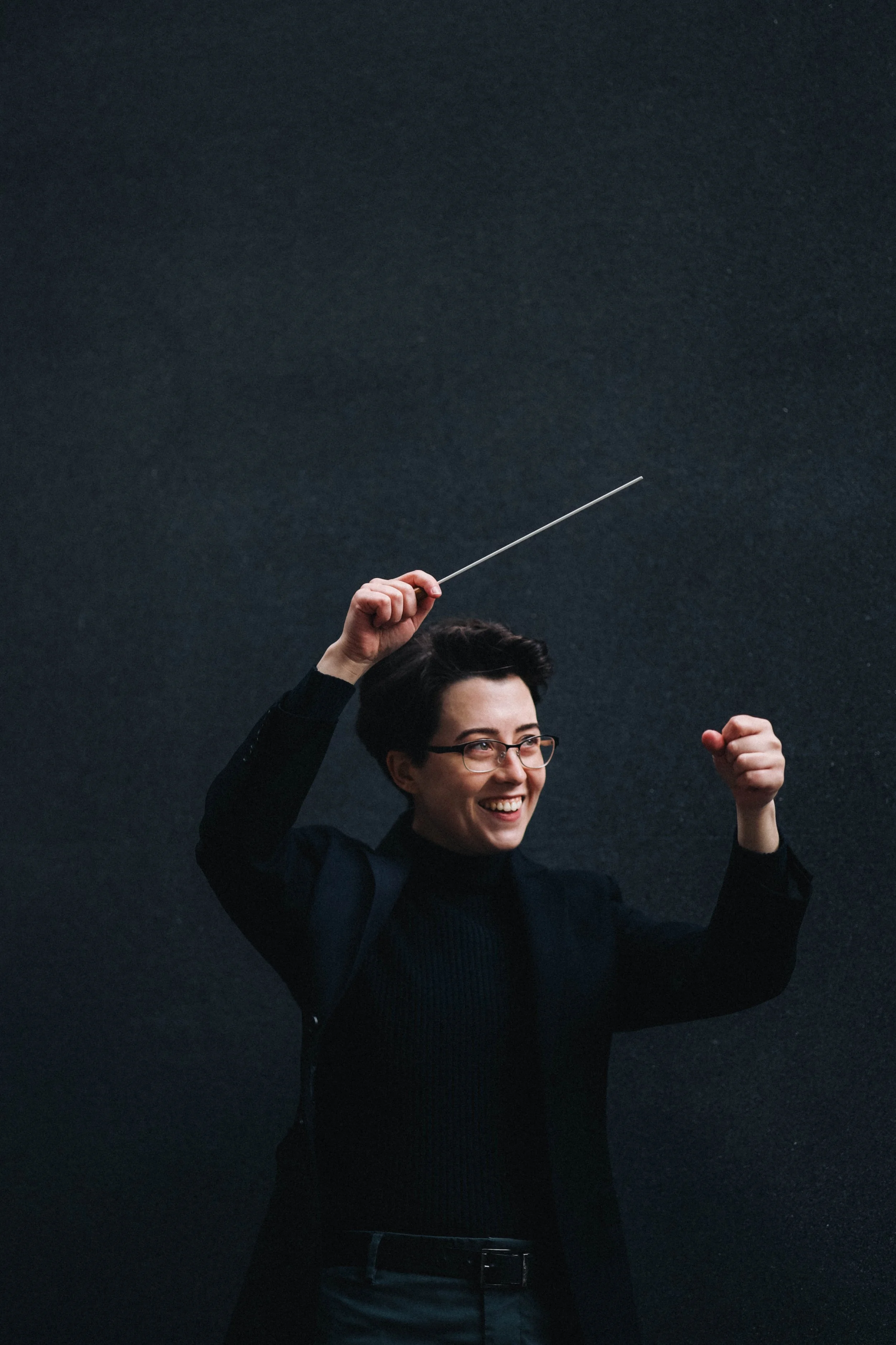A person with short dark hair and glasses, wearing a black blazer and shirt, holding a conductor's baton over their head, standing against a dark textured background.